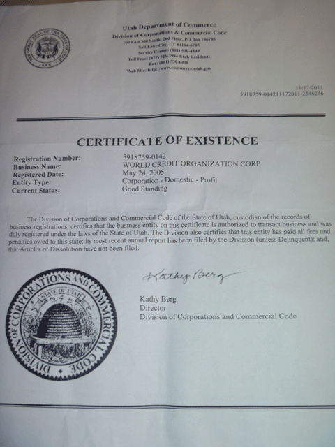 (后更名为世界信用组织有限公司、公司证书无须每年换发):编号:886057